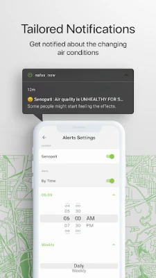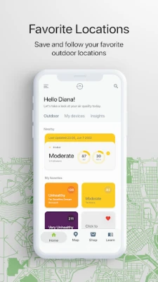 Each location displays recommendations for activities and lifestyle depending on the current air quality. When the air is bad, you can decide to reduce or reschedule outdoor physical activities, shut your windows, etc.