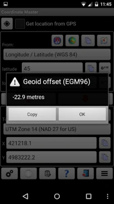 The app can also compute the geoid height offset for a given location, using the EGM96 model. Geoid offset can be subtracted from the height reported by GPS to give your actual height above sea level.