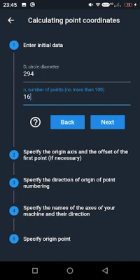 The application implements many settings. It is required to enter the diameter of the circle and the number of points. You can specify the origin axis, the offset angle of the first point to the nearest second, specify the direction of the first point offset. It is possible to set the direction of counting the numbering of points, change the direction of the axes, change their names. You can also set the origin to the center of the circle, or specify the coordinates of the center relative to the origin. The result of the calculation is a sketch with an image of all points and a table in which the coordinates of each point are indicated.