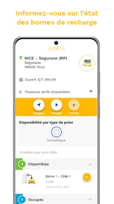Fonctionnalités de l’application : • Géolocalisez les bornes Prise de Nice et leur disponibilité • Réservez la borne à l’horaire qui vous convient • Abonnez-vous pour bénéficier de tarifs plus avantageux • Payez directement votre charge pour gagner du temps • Suivez vos consommations et vos factures • Ajoutez vos bornes favorites